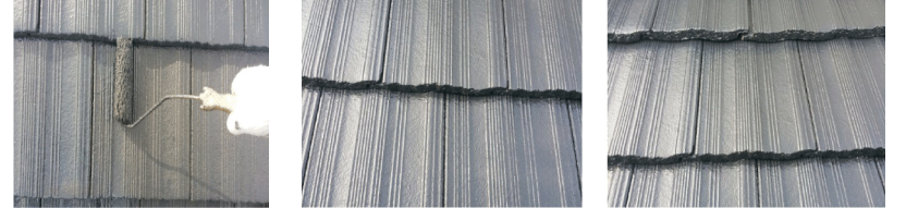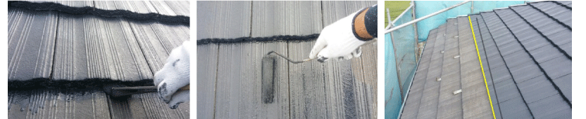 まず経年した屋根のコケ・カビ・汚れ・スラリー層を丁寧に落としていきます。只、高圧洗浄だけでは綺麗に落とせないので下塗り材でスラリー層を強固し付着性を強いものにし上塗りの作業に移る訳ですが・・