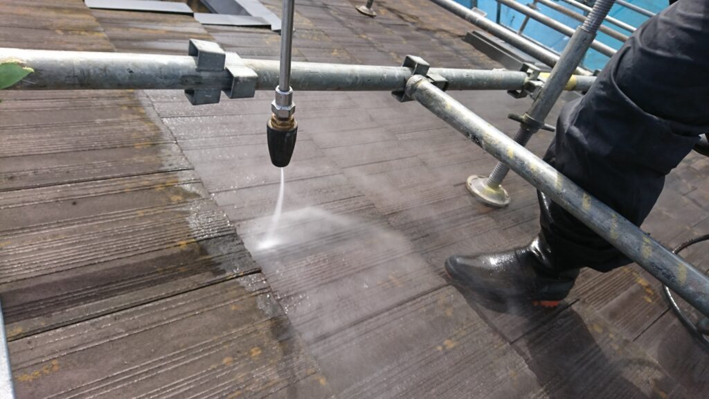 高圧洗浄で汚れなどを出来るだけ落としていきます。写真はトルネードノズル仕様時の高圧洗浄です。