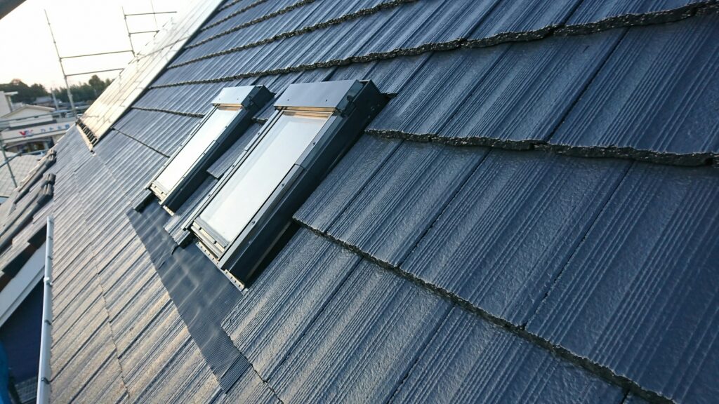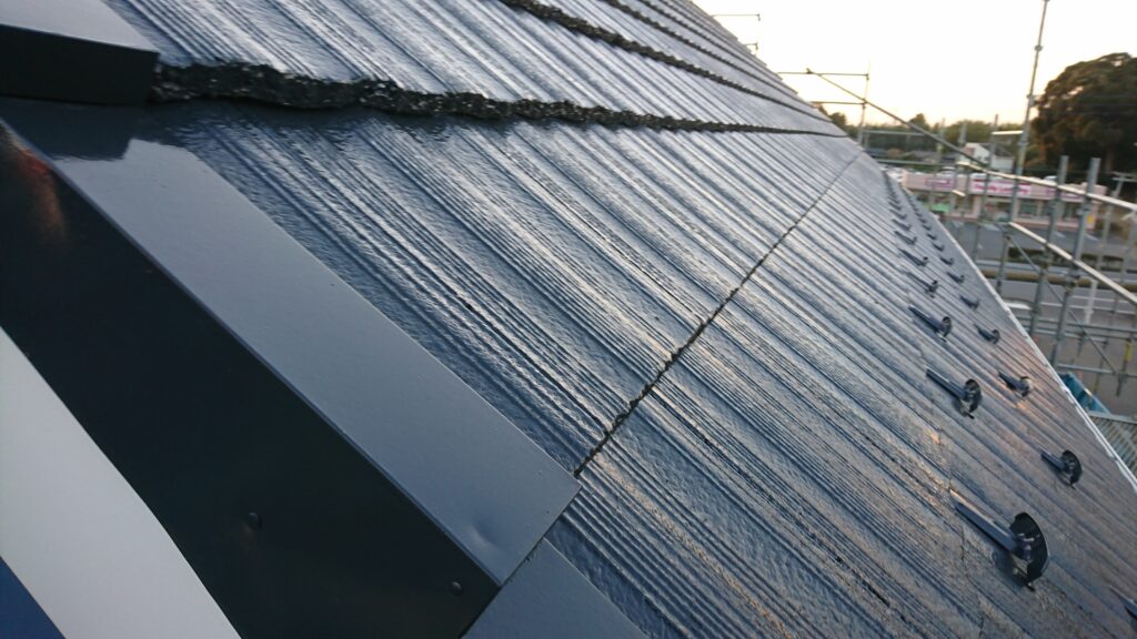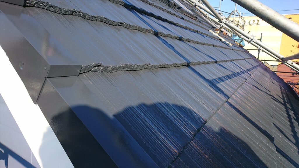 屋根塗料に定評のある水谷ペイント社の2液型シリコン塗料ルーフマイルドSiを仕上げに使用しました。