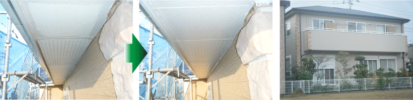 軒天シーラーを入れて3回塗りです。(左写真、中央写真)参考案件を御紹介させて頂きました。