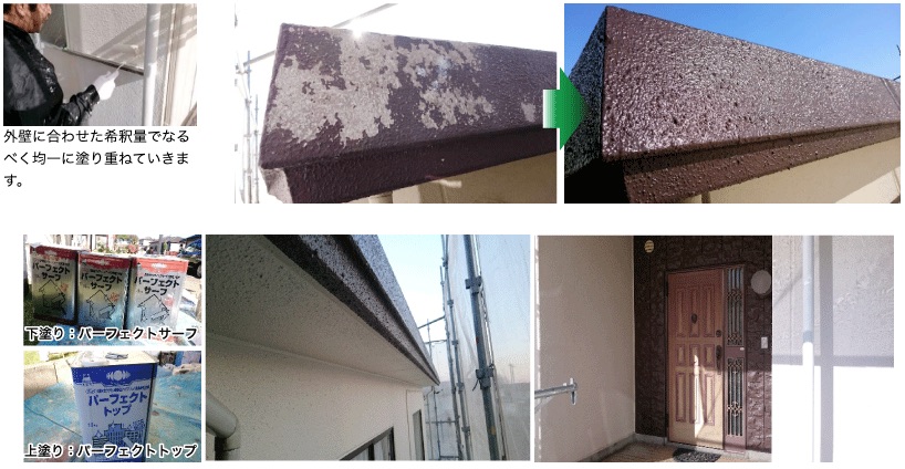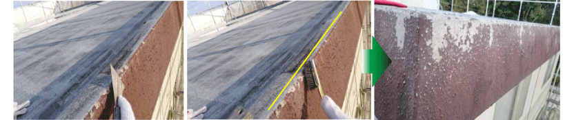 経年と共に外壁の下地が劣化し剥がれを起こしたと思われます。皮スキやワイヤーブラシで削り落とし表面を均した後に