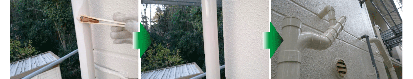 雨樋・パイプ下塗りにはニュー密着バインダー(上塗り塗料との密着力に定評)を塗布後、ファインSi (3分艶消し)で仕上げました。