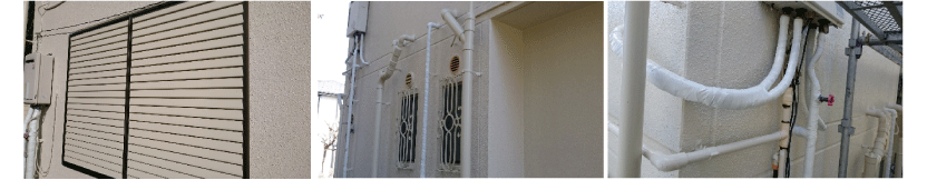 右端:雨戸塗装ファインS仕上げ。  中央・左端:建物全体を綺麗にしますとクーラーガス管ホースの劣化が悪い意味で