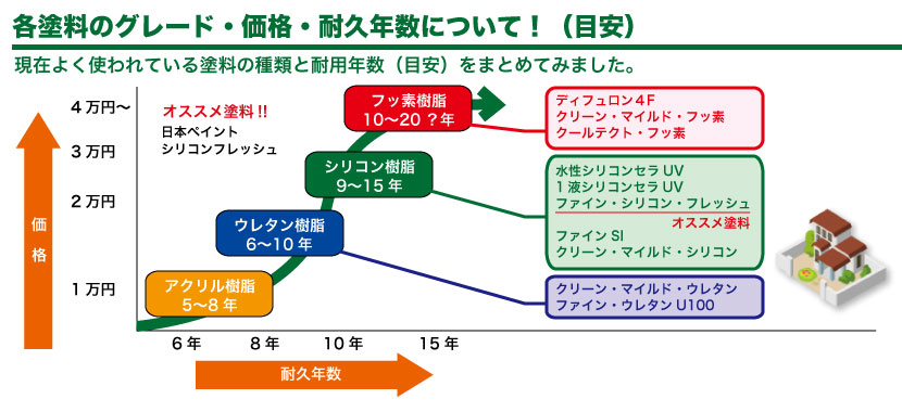 各塗料のグレード・価格・耐久年数について(※あくまでも目安です)