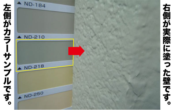 2、カタログの見本と実際に広い壁に塗装した場合を下の写真で、くらべて見てください。