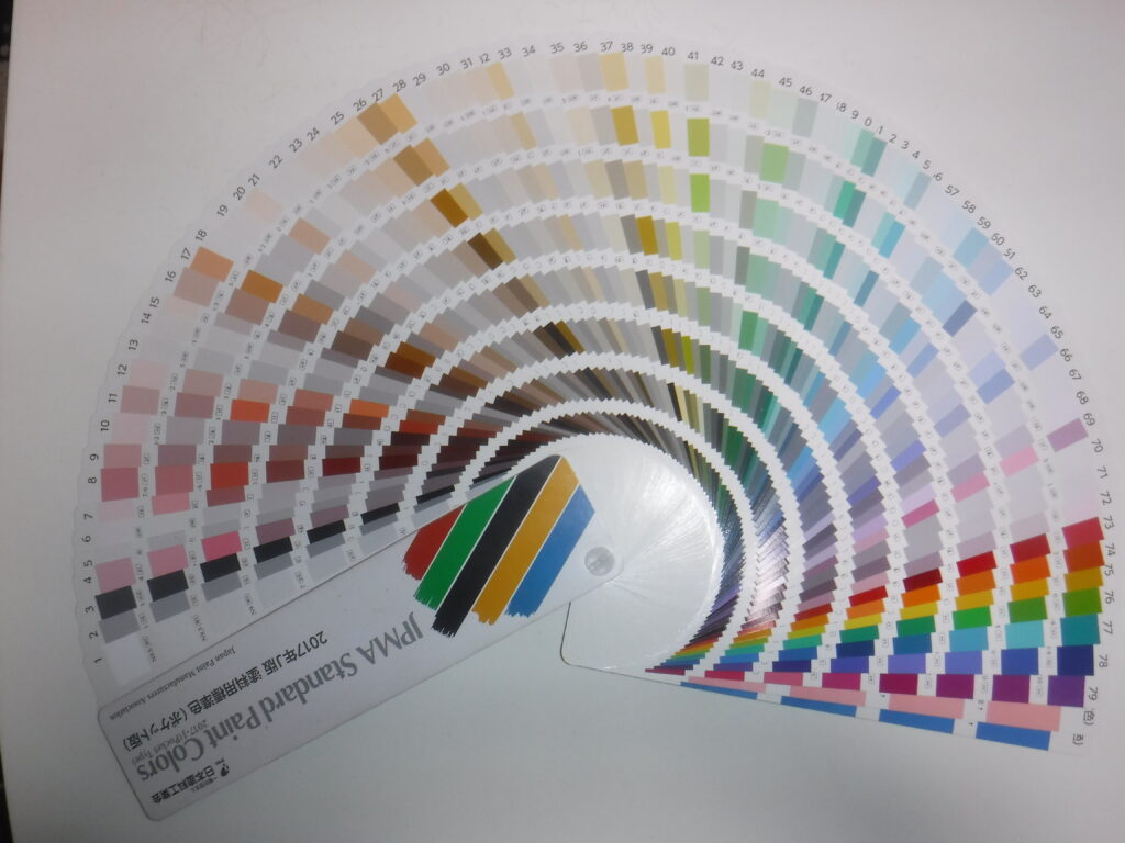 このように※小さい面積(カタログ・見本帳)でみると濃い色でも実際に塗装したら、やや明るくなるので自分が思った色より少し濃い色を選んでおくとよいと思います。